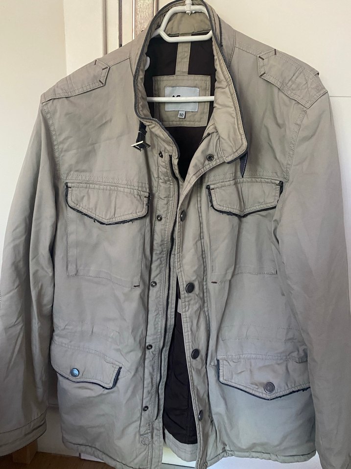 Gri renkli erkek midi mont, düğmeli ve notalı yakalıdır. Sentetik kumaştan yapılmış, uzun kollu ve rahat kesimdir. Günlük sokak stili için uygundur.