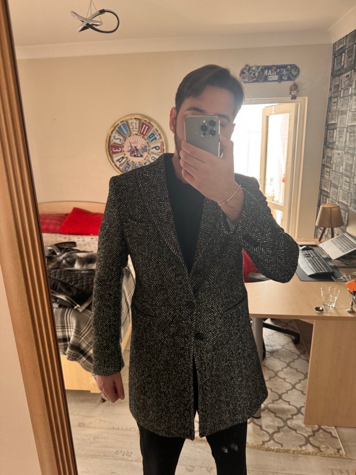 Gri renkte, yün kumaştan yapılmış erkek midi kaban. Düğmeli ve notched lapel yakaya sahip, normal kesim ve uzun kolludur. Ofis ve günlük kullanıma uygundur. Üründe yırtık deforme bulunmamaktadır. Üstünde ufak tüylenmeler bulunmaktadır. Kışlık mont olarak kullanılan bir üründür. Gündelik giyim içim uygun.