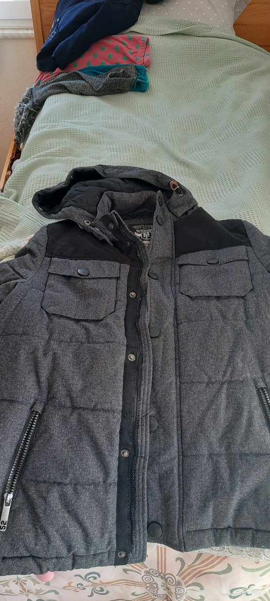 Gri düğmeli erkek mont, Uzun kollu, yumuşak ve sıcak dokulu kumaştan, kapüşonlu ve çok ceplidir.13 14 yaş için uygundur çok iyi durumda