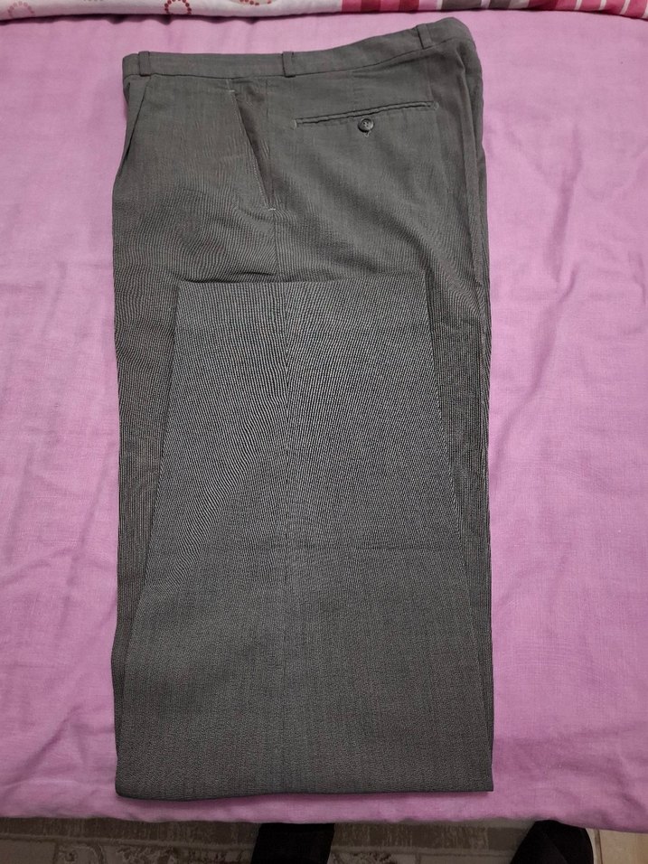 Düğmeli, gri renkte, sentetik kumaştan üretilmiş, regular fit erkek ofis pantolonu. İş ve günlük şıklık için uygundur.
