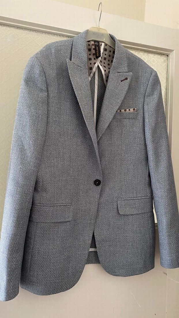 Gri renkte, düğmeli ve klasik modern stile sahip erkek ofis takımı. Uzun kollu, normal kesim ve çıt detaylıdır. ️