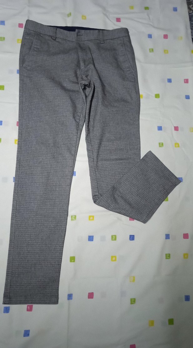 Bu gri erkek pantolon, düğmeli kapama ve normal kesime sahiptir. Düz sentetik kumaştan yapılmış, günlük kullanıma uygundur.
