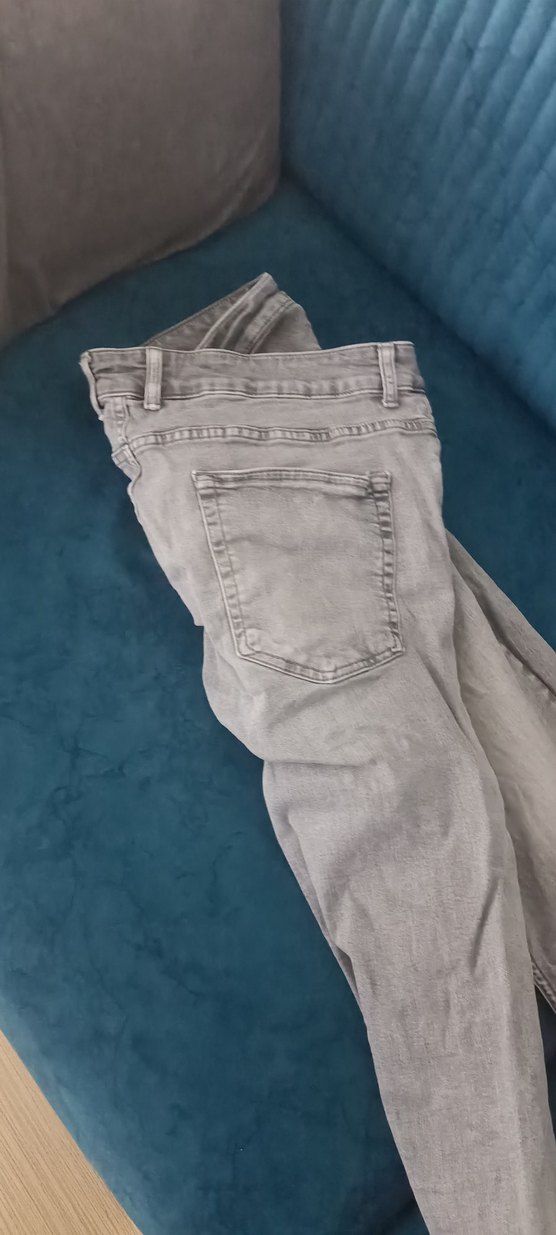 Gri renkte, düğmeli, normal uzunlukta ve regular fit erkek denim pantolon. Günlük sokak stili için uygundur.