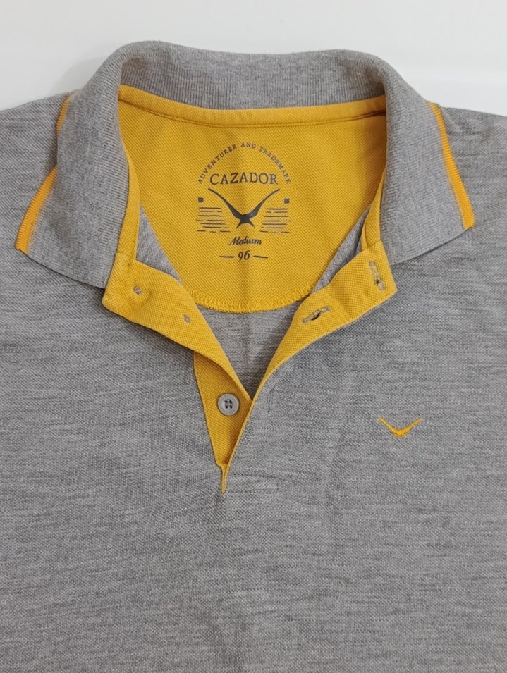 Gri renkte, düğmeli yakalı erkek polo tişörtü. Kısa kollu, regular fit ve günlük kullanım için uygundur. Cazador markası yakada yer alır.