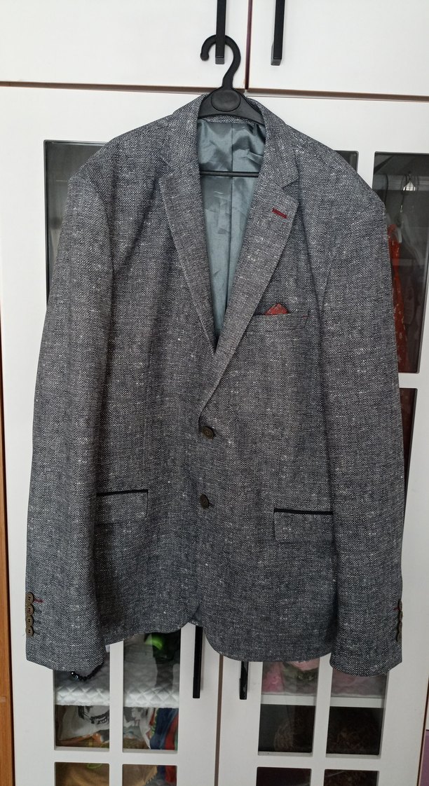Gri renkli, düğmeli ve kesik yaka detaylı erkek takım ceketi. Uzun kollu ve normal kesim, 56 bedendir