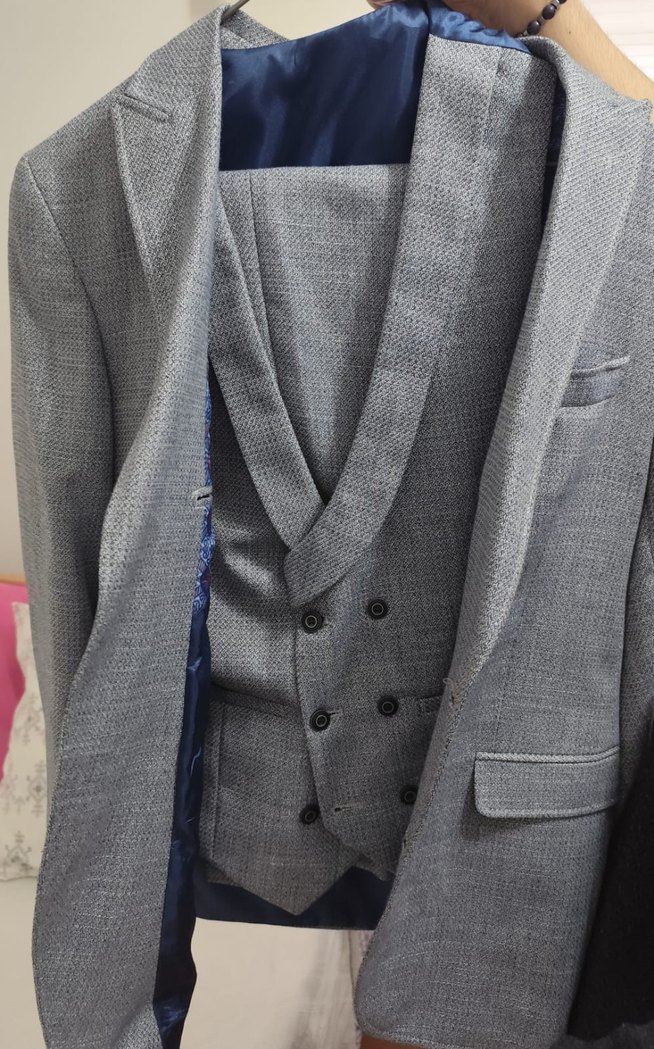 Gri renkli, düğmeli ve klasik kesimli erkek takım elbisesi. Modern klasik tarzda, ofis kullanımı için uygun, desen içermeyen şık bir model.