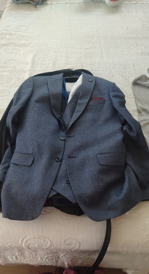 Düğmeli, normal uzunlukta gri erkek takım elbisesi, kesimi rahat ve uzun kolludur. Desensiz, klasik ve şık bir görünüme sahiptir. ️