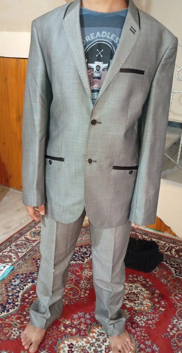 Gri renkte, düğmeli ve klasik yaka detaylı erkek takım elbisesi. Uzun kollu ve normal boyda, modern klasik tarzda ofis kullanımı için uygundur. 1600 tldir