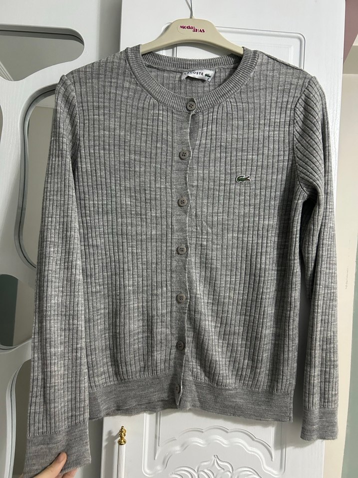 Gri renkli, düğmeli triko hırka, uzun kollu ve bisiklet yaka. Normal kesim, günlük sokak stiline uygun.