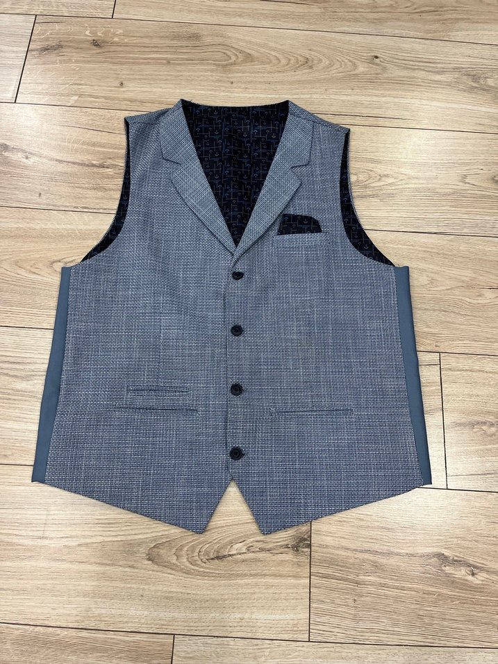 Gri renkte, düğmeli, cepli ve klasik yaka detaylı erkek yelek. Ofis veya günlük kullanıma uygun, regular fit kesim.