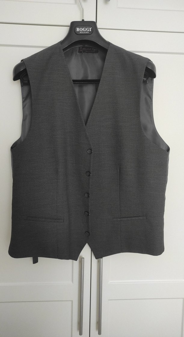 Gri renkte, düğmeli ve kesik yakalı erkek yelek. Normal kesim ve sentetik kumaştan, ofis kullanımı için uygun. sıfır hiç kullanılmamıştır takım elbisenin içindeki yelekdir kumaş
