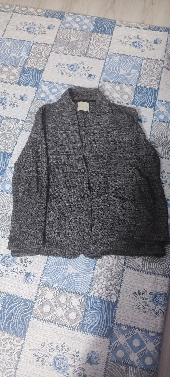 Gri düğmeli erkek yün ceket, notlu yaka ve uzun kollu. Normal kesim ve midi boyda, rahat ve gündelik kullanıma uygun.