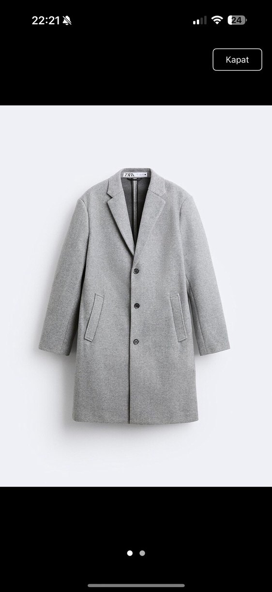 Gri yün kaban, düğmeli ve kesimli yaka detayına sahip. Normal kesim ve midi boyda, uzun kollu ve cep detaylıdır. Ofis ve günlük kullanıma uygundur.
