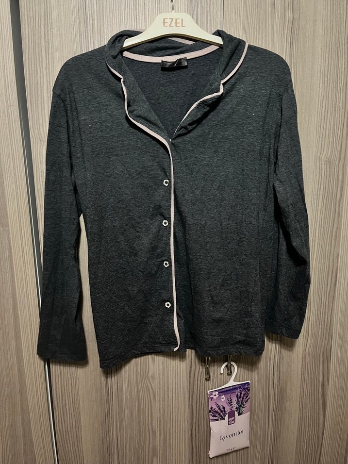 Gri renkli, uzun kollu ve düğmeli hamile hırkasıdır. Notlu yaka ve rahat kesime sahiptir. Yumuşak keten kumaştan üretilmiş, midi boyda ve desen içermez. EZEL askıda.