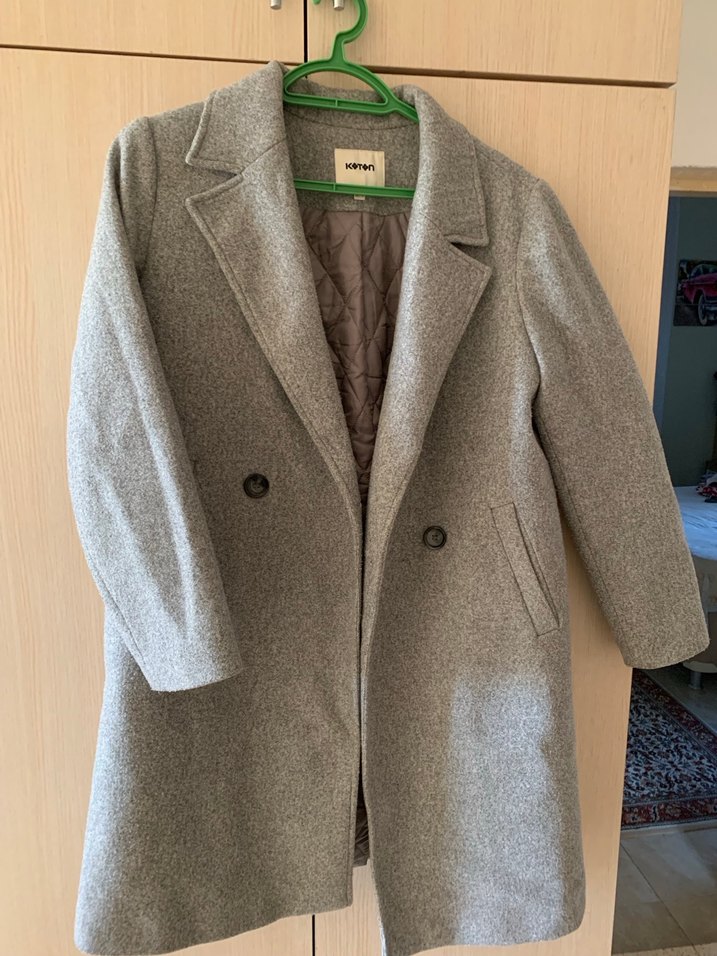 Gri renkte, düğmeli, kapitone astarlı klasik yakalı kaban. Yan cepleri bulunur.