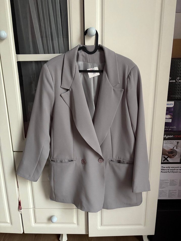 Kadınlar için gri renkte, düğmeli, yakalı dokulu kumaştan yapılmış, normal kesim ve midi boyda blazer ceket. Ofis için uygundur. Kolları kalıbına göre biraz dar, ölçü sorabilirsiniz