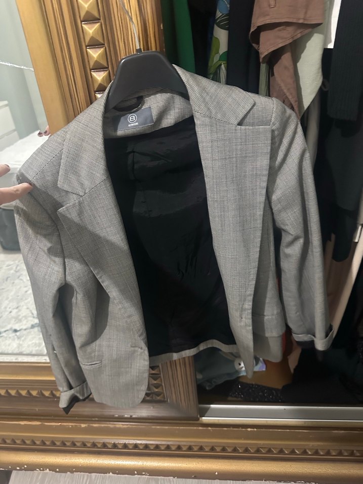 Gri renkte, düğmeli ve kruvaze yakalı kadın blazer ceket. Uzun kollu, normal kesim ve sentetik dokulu kumaştan üretilmiştir. Ofis ve günlük kullanıma uygundur.