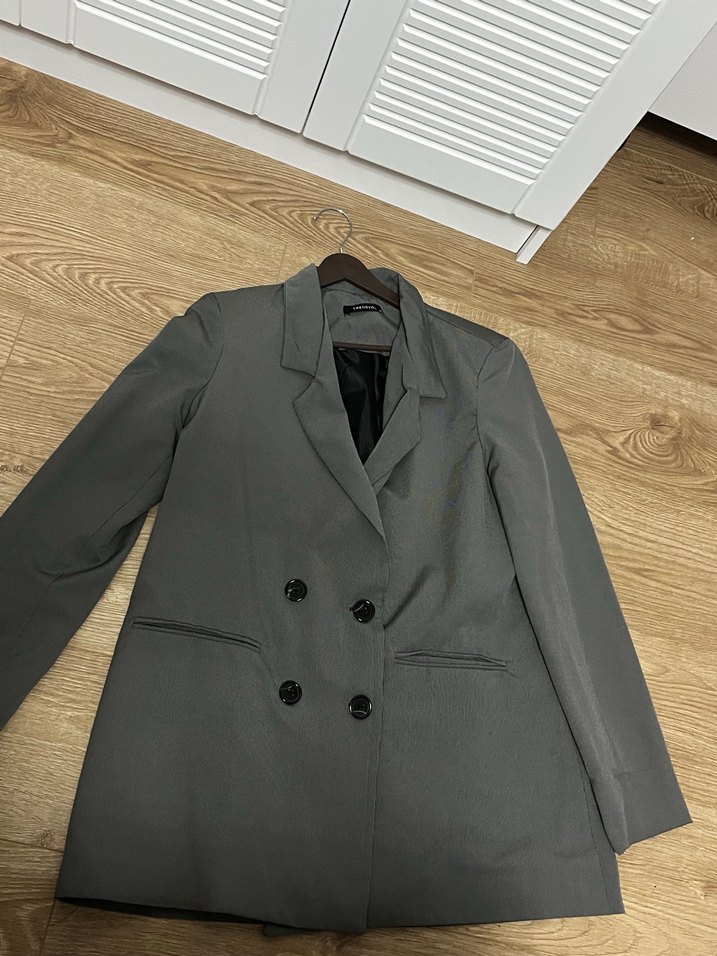 Gri renkli, düğmeli kadın blazer ceket. Sentetik kumaştan, normal boy ve regular fit kesimle ofis kullanımı için uygundur. Neredeyse hiç giyilmedi.