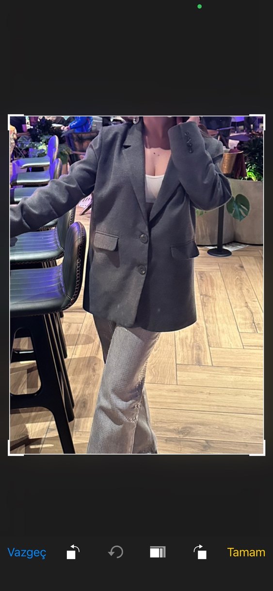 Gri renkte, düğmeli ve notched lapel yaka detaylı, uzun kollu kadın blazer ceket. Normal midi boyda, rahat kesim ve yumuşak sentetik kumaştan üretilmiştir.