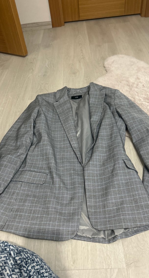 Gri, düğmeli, uzun kollu blazer ceket. Normal kesim ve notched yaka detaylı, ofis ve günlük kullanım için uygun. Sıfır etiketsiz astarlı