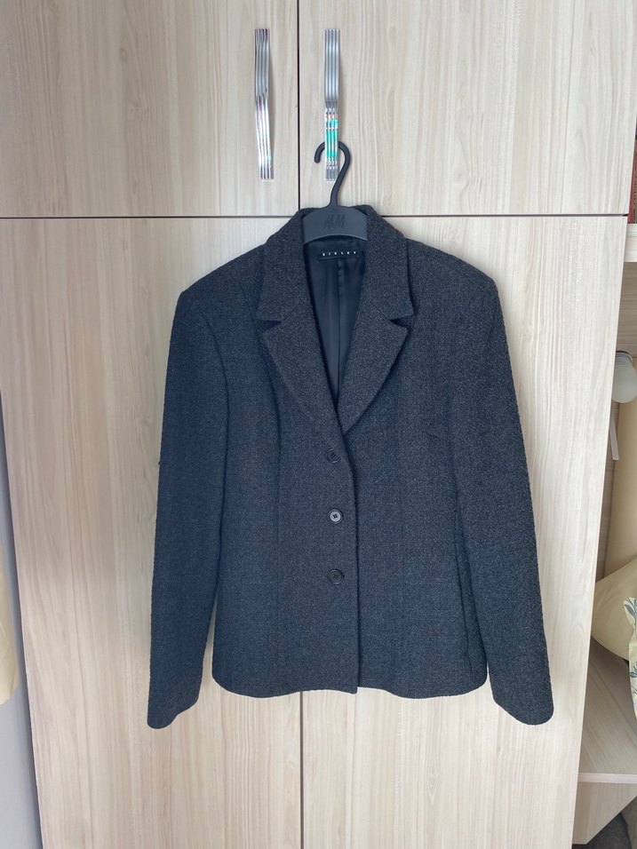 Kadınlar için gri düğmeli blazer ceket, yumuşak yünden, normal kesim, uzun kollu ve midi boyda. Ofis için uygun, desen içermeyen şık tasarım. Koyu gri renkte, kumaş cinsi görsellerden görülebilir. Her türlü kıyafet üzerine çok yakışan, şık duran spor tarzı bir cekettir. Çok az giyildi. Kol altından genişlik 50 cm, omuz başından genişlik 43 cm, omuzdan ölçülen boy 60 cm. #sisley #sisleyceket #sporceket #ceket