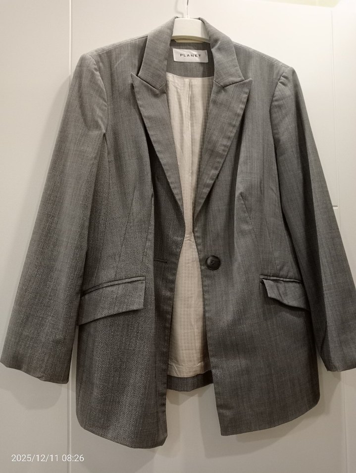 Gri renkte, düğmeli ön kapamalı, astarlı kadın blazer ceket. Yumuşak keten kumaştan, normal uzunlukta ve uzun kolludur. Ofis ve günlük kombinlere uygundur.
