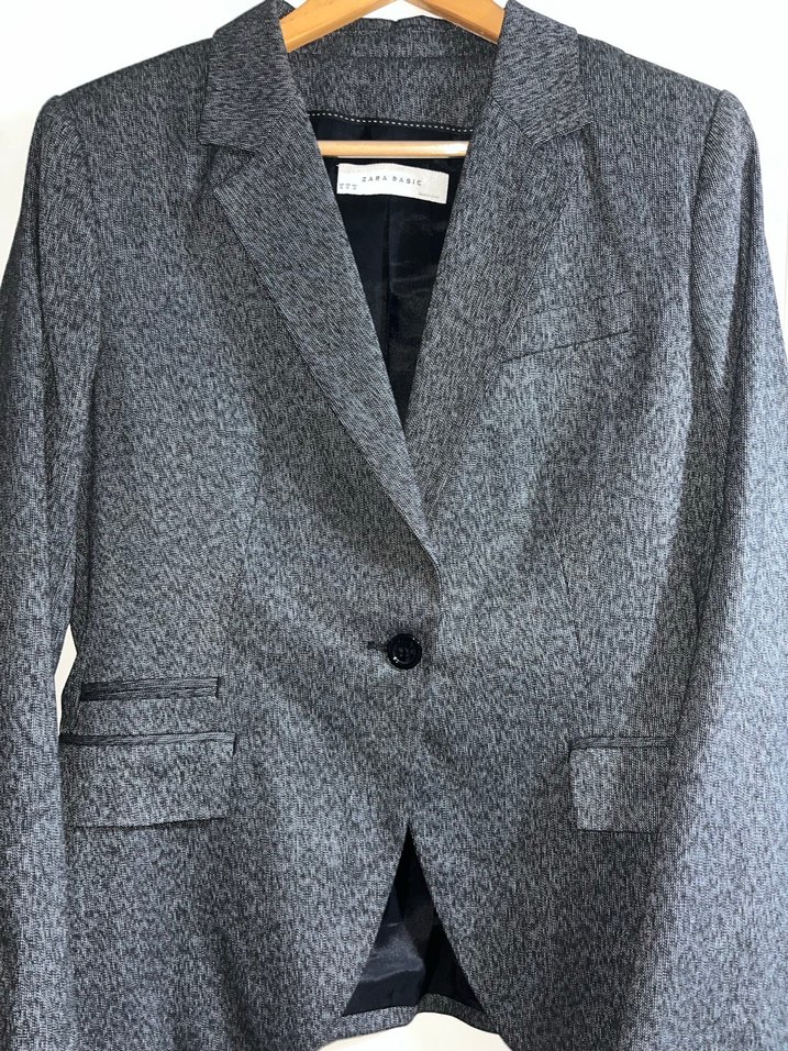 Gri renkli, düğmeli, normal boyda kadın blazer ceket. Uzun kollu ve iş ortamına uygun, çağdaş tasarıma sahiptir.