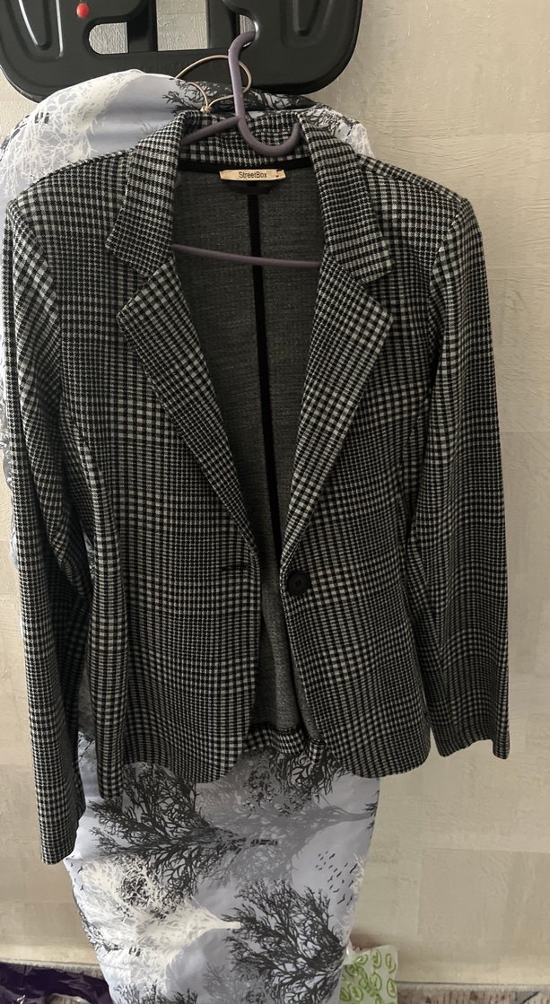 Gri, düğmeli, uzun kollu kadın blazer. Normal kesim ve midi boyda, iş ve gündelik stil için uygun. Sentetik yumuşak kumaştan, düz ve şık görünümlü.