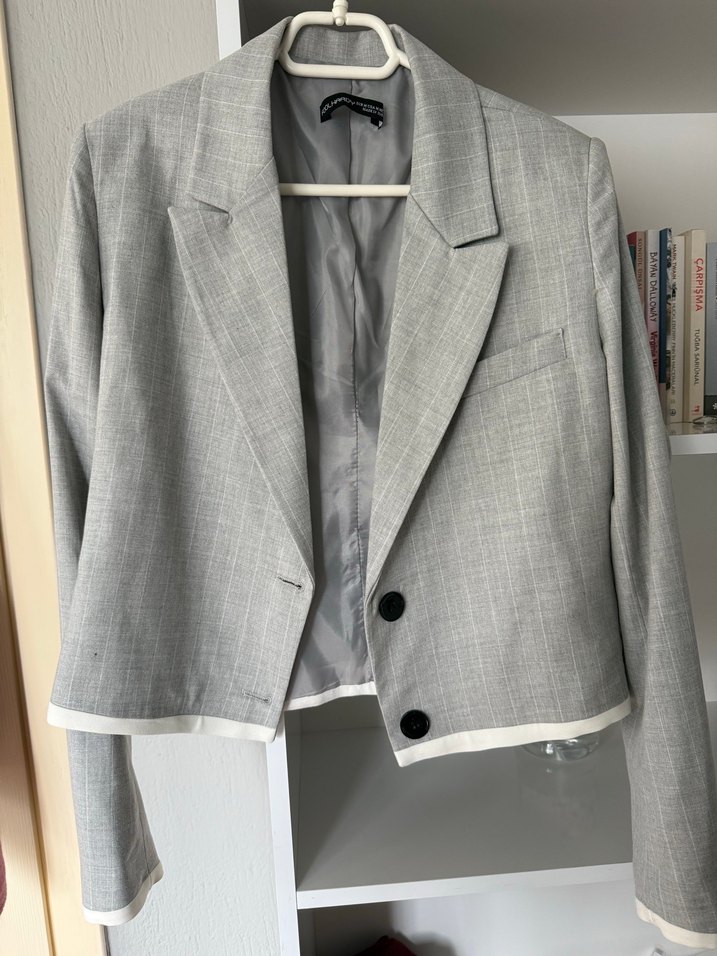 Gri , düğmeli, normal boy midi uzunlukta, uzun kollu kadın blazer ceket. Notched lapel yakaya sahip, rahat kesim, ofis ve sokak tarzına uygun.