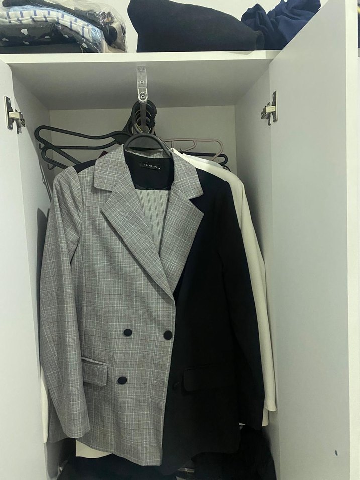 Gri renk, düğmeli, kesik yaka detaylı kadın blazer cekettir. Normal kesim ve midi uzunluktadır. Sentetik dokulu kumaştan, askılı kollu ve düz desensizdir.