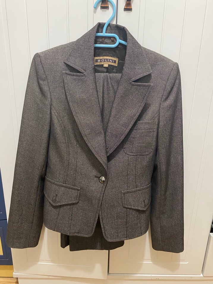 Modern klasik tarzda, düğmeli, uzun kollu, gri renkte, normal boyda ve rfit kadın blazer ceket pantalon. Ofis kullanımı için uygundur. Kızlar 161 boyum 54 kilodayım şuanki duruşu sıkmıyor rahat .