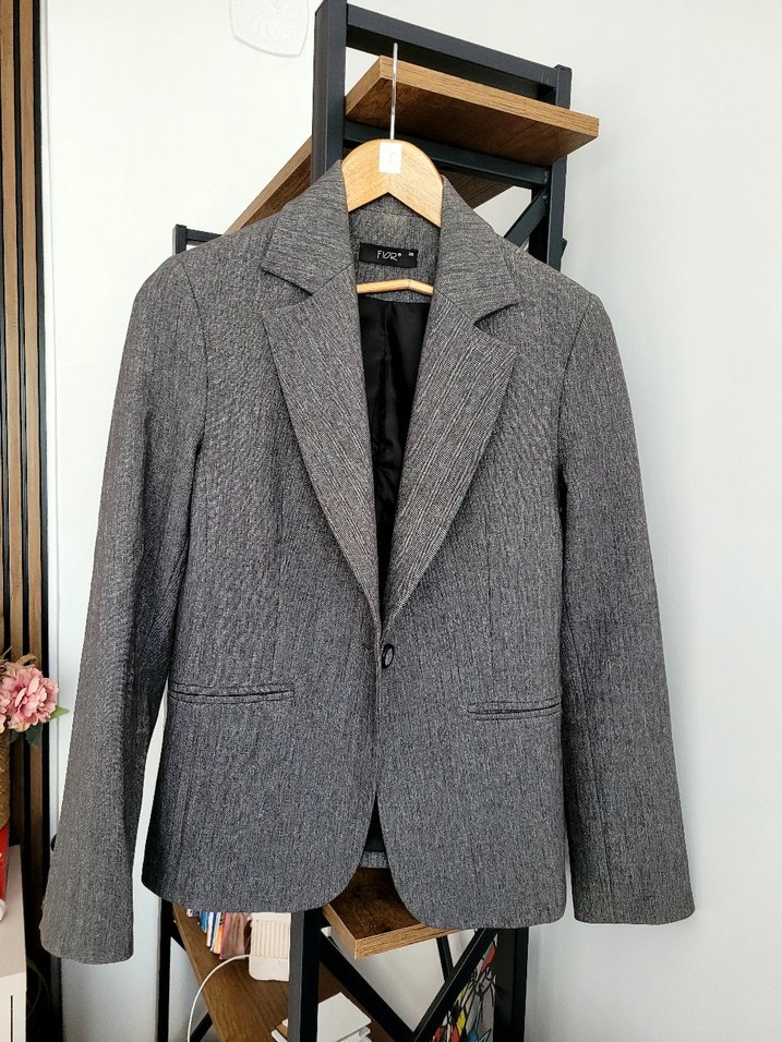 Gri renkte, düğmeli, normal boyda, uzun kollu kadın ceket. Modern klasik tarzda, ofis için uygun, sentetik kumaştan üretilmiştir.