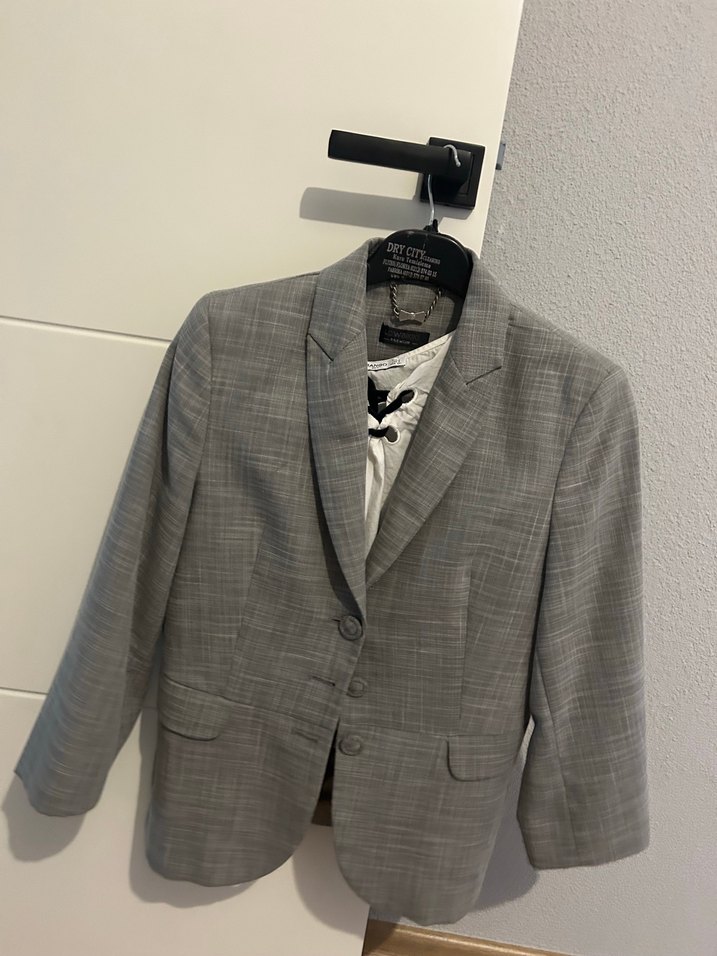 Gri, düğmeli ve uzun kollu kadın ceket. Normal kesim ve klasik yaka ile ofis ve günlük stil için uygundur.