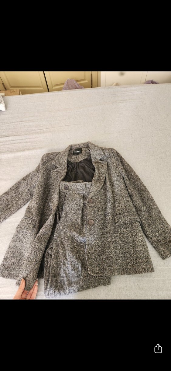 Gri renkli, düğmeli, regular fit kadın ceket. Yumuşak keten kumaştan, uzun kollu, normal midi boyda, ofis ve rahat sokak tarzı için uygun.