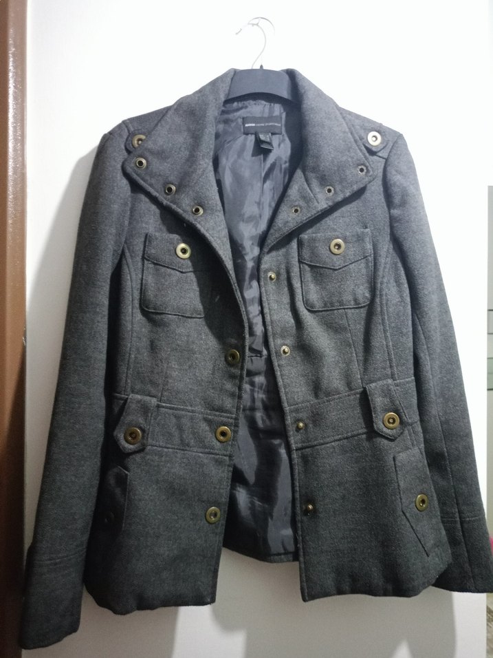 Düğmeli, gri denim kumaştan yapılmış, notched lapel yakalı kadın ceket. Uzun kollu, normal kesim ve midi boyda, ofis ve günlük kullanıma uygun.