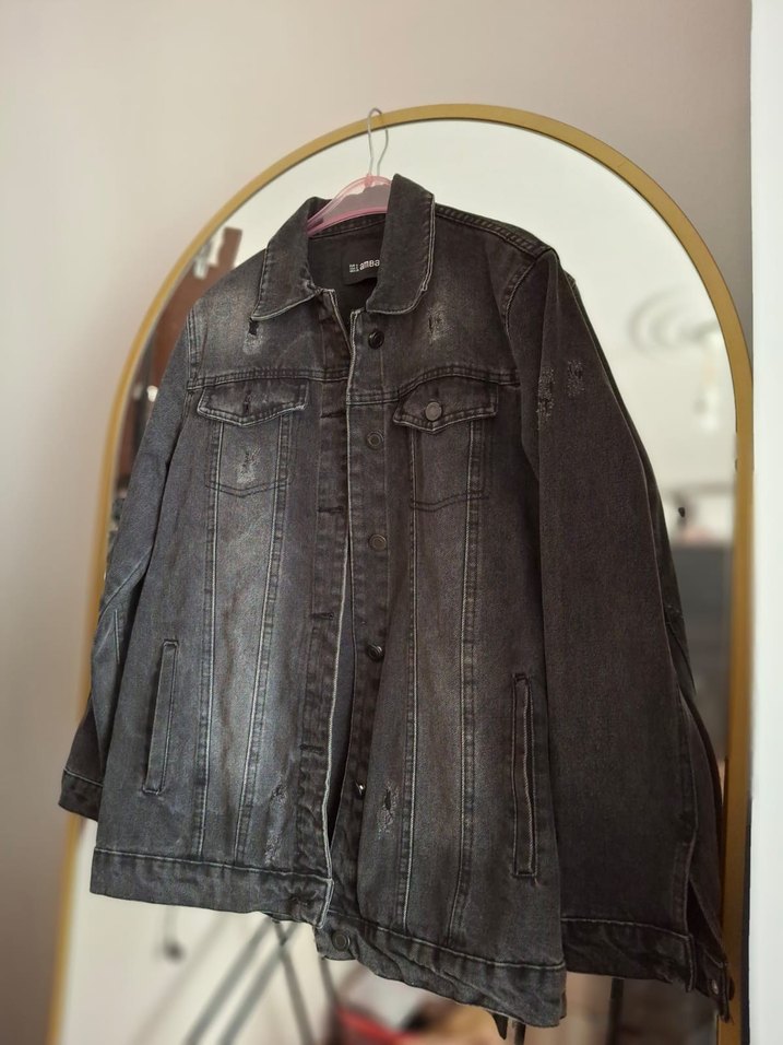 Bu bol kesim, koyu gri kadın denim ceket; kesik yaka, uzun kollu ve düğmeli ön tasarıma sahiptir. Normal midi boyda, sade ve desensiz, gündelik sokak stili için uygundur.