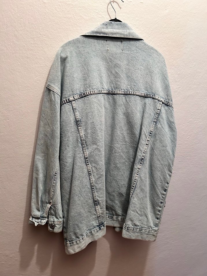 Gri renkte, düğmeli, notched yakalı ve uzun kollu bol kesim kadın denim ceket, günlük sokak stili için uygun.