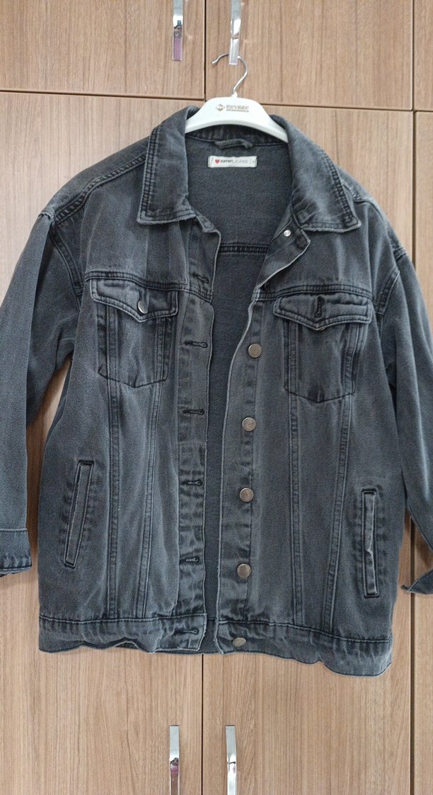 Gri renkte, düğmeli ve cep detaylı, bol kesim uzun kollu denim ceket. Günlük kullanıma uygun, rahat ve sokak stilini yansıtan midi boyda ceket.