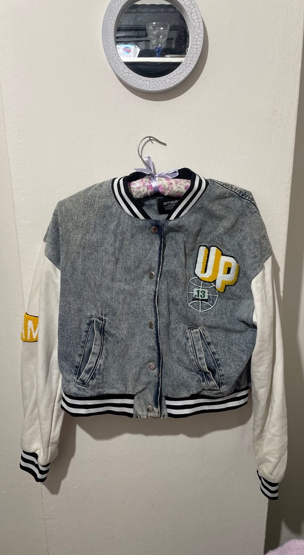 Düğmeli, uzun kollu gri denim ceket. Spor tarzı yamalar ve çizgili ribana manşetlerle tamamlanmıştır. Görüğünüz gibi sadece çok hafif kurşun kalem lekesi var