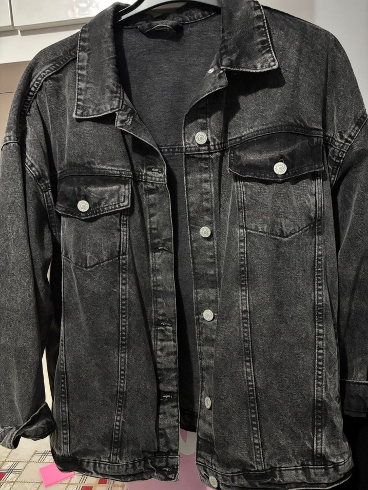 Gri renk, düğmeli, uzun kollu, bol kesim ve yakalı kadın denim ceket. Sokak stiline uygun rahat bir tasarım.
