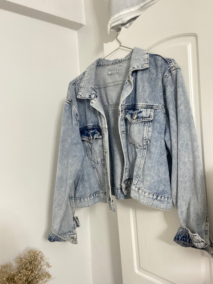 Bu kadın denim ceket, düğmeli ve notlu yaka detaylı bol kesime sahiptir. Uzun kollu ve normal uzunluktadır, gündelik sokak stiline uygundur. Soluk mavi renkte ve desensizdir.