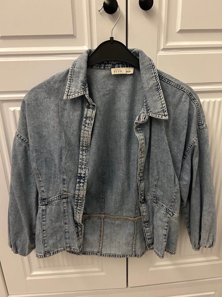 Gri renkli, düğmeli, notched lapel yakalı, uzun kollu, bol kesim kadın denim ceket. Günlük sokak stili için ideal midi boyda.