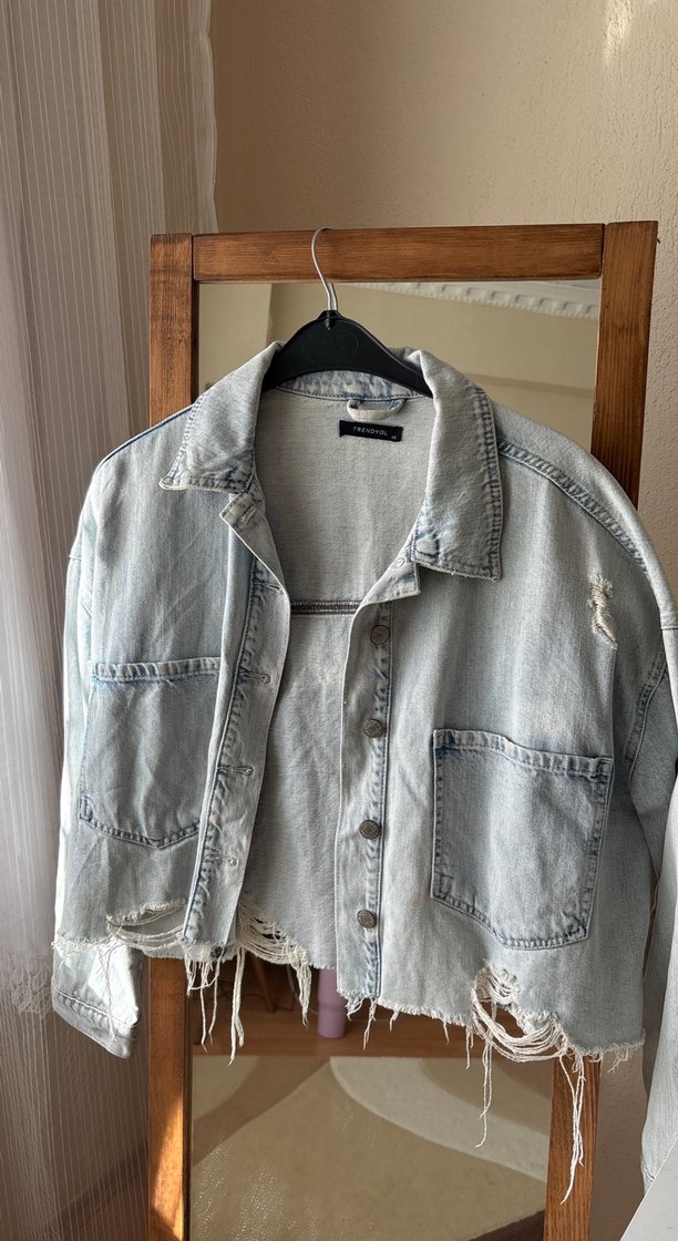 Gri renk düğmeli, bol kesim denim ceket. Notlu yaka ve uzun kolludur. Midi boyda, sokak tarzı ve günlük kullanıma uygun yıpranmış detaylar içerir. bol kesimdir.
