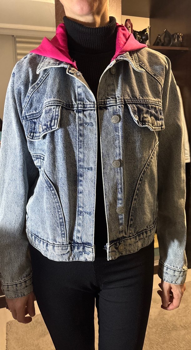 Düğmeli, gri renkli, uzun kollu, normal boyda kadın denim ceket. Rahat kesimi ve kesik yaka detayıyla günlük kullanıma uygun.
