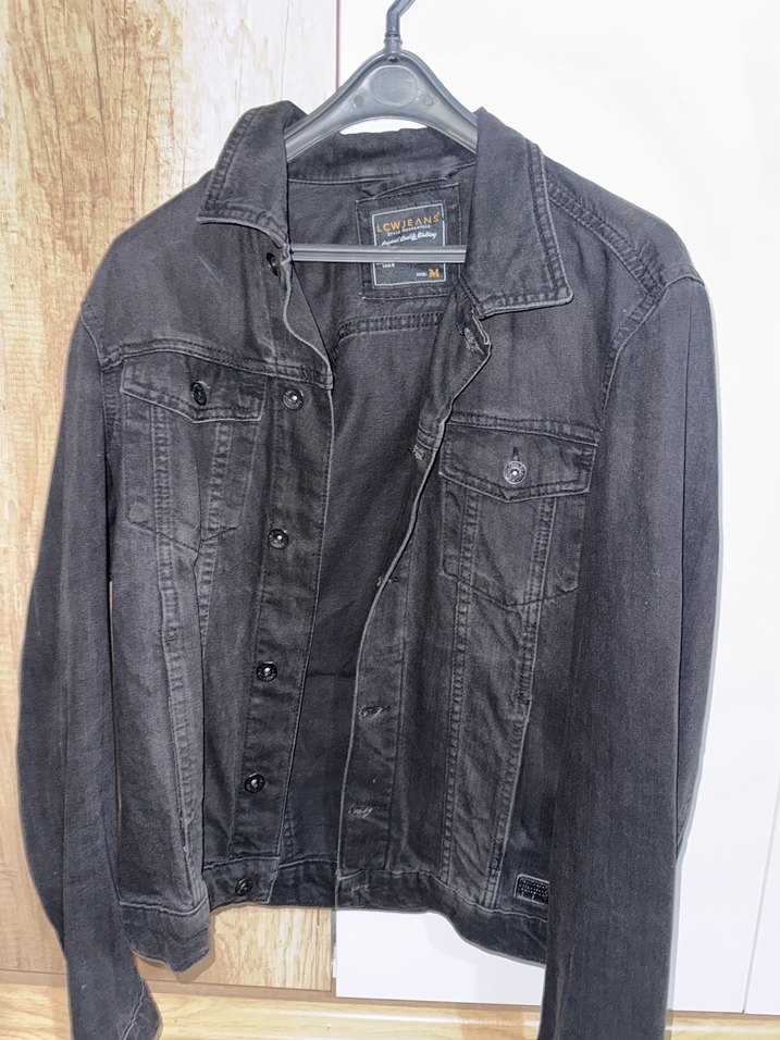 Gri renk, düğmeli, notched yaka ve uzun kollu, bol kesim kadın denim ceket. Günlük ve sokak stiline uygun.