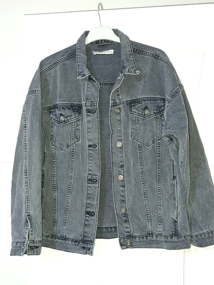 Gri düğmeli kadın denim ceket, bol kesim, uzun kollu ve yakası kesik detaylıdır. Günlük kullanıma uygun rahat bir sokak stili sunar.