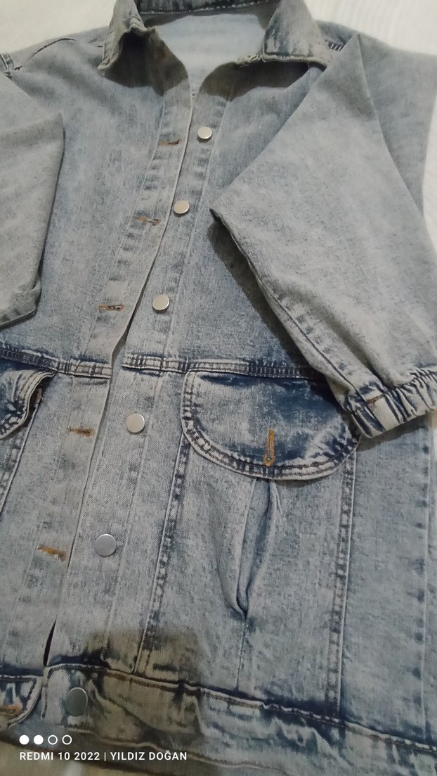 Gri denim ceket, düğmeli ön ve lastikli uzun kollara sahiptir. Salaş kesim ve kesik yaka detaylarıyla sokak stiline uygundur.