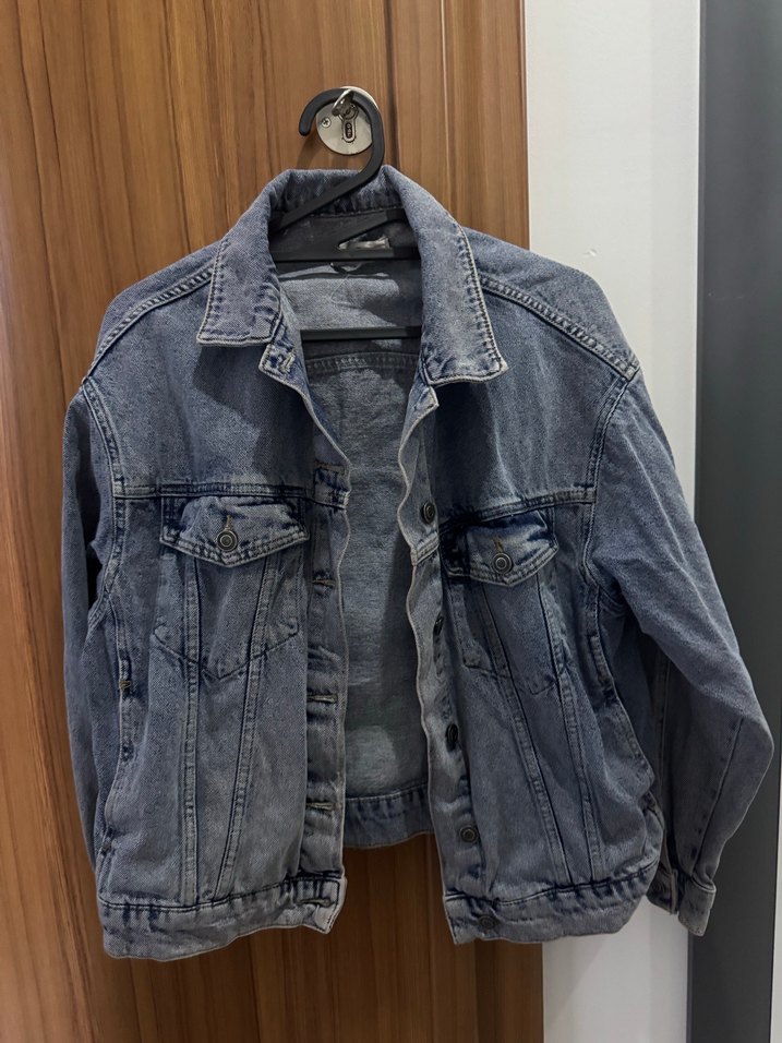 Gri renk, düğmeli, uzun kollu, bol kesim kadın denim ceket. Notlu yaka ve göğüs cepleri ile günlük rahat kullanım için uygun.