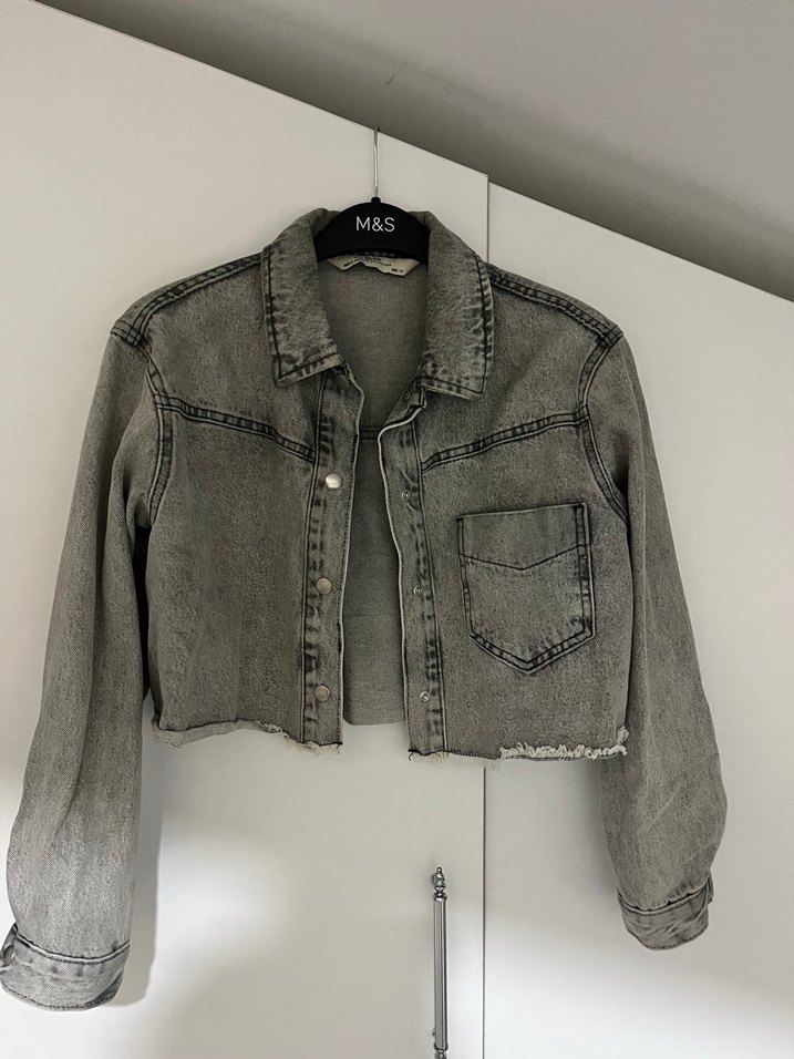 Gri renkli, düğmeli, bol kesim kadın denim ceket. Uzun kollu, yakası kesik detaylı ve tek cep bulunur. Günlük sokak stili için uygundur.