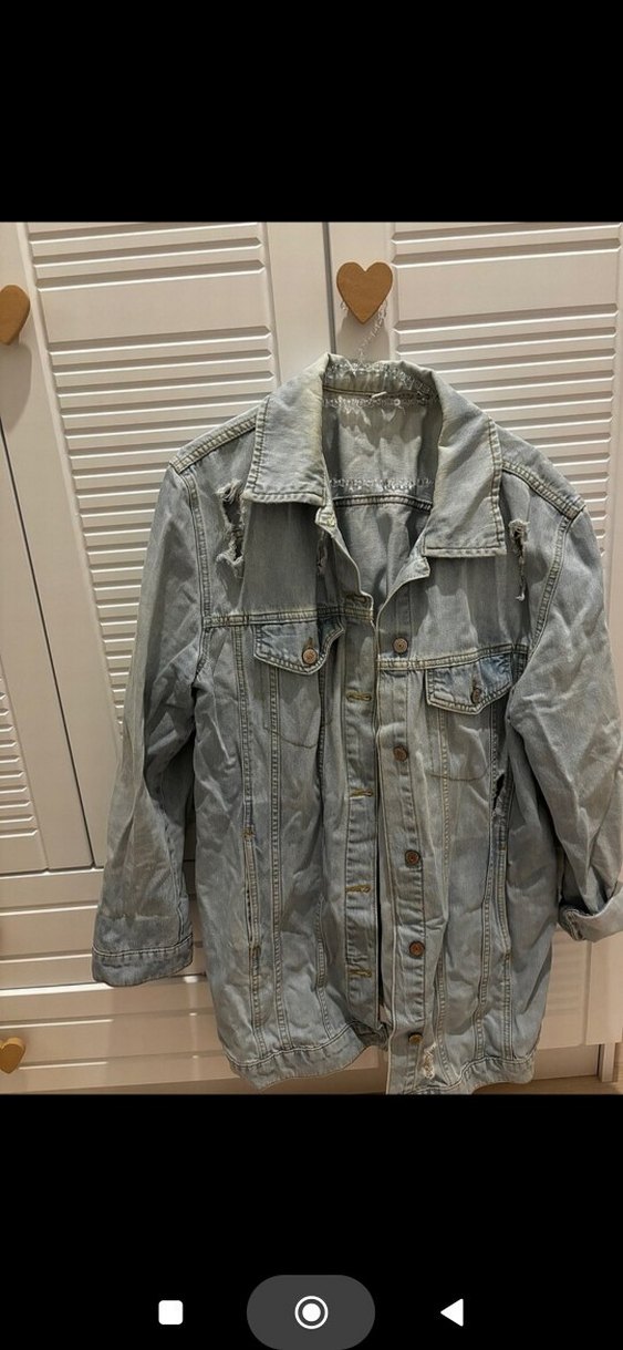 Gri düğmeli denim ceket, notalı yakalı, bol kesim ve uzun kolludur. Midi boyda, desen içermeyen bu parça günlük kullanıma uygundur.